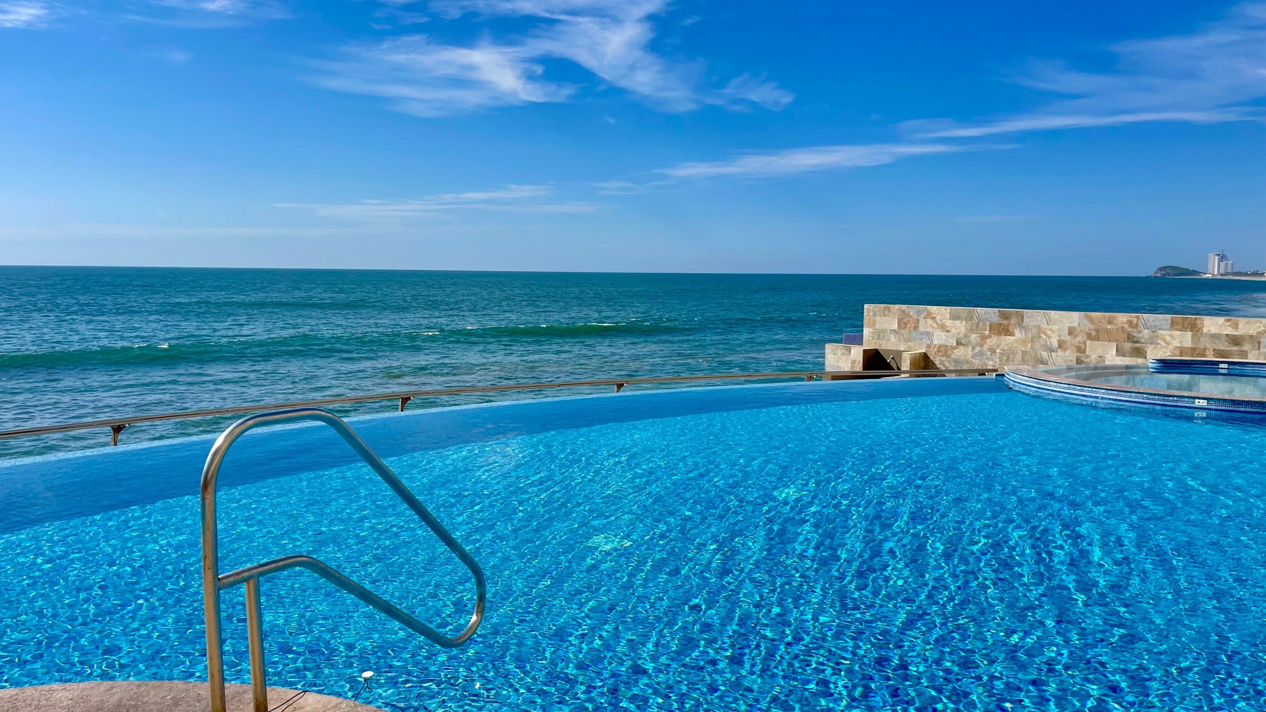 - Piscina tipo lounge con áreas de descanso frente al océano